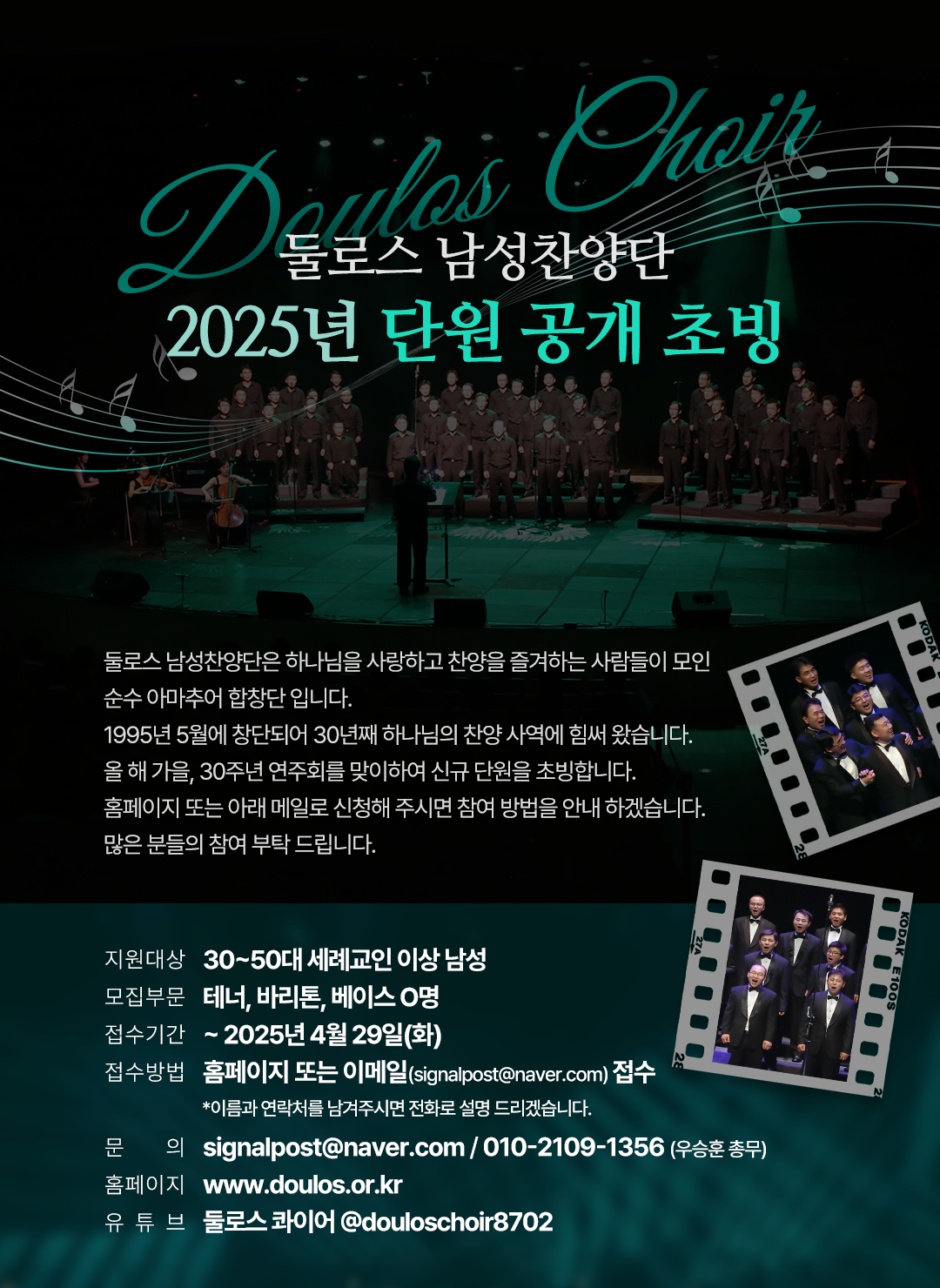 둘로스남성찬양단 은하나님을 사랑하고 찬양을 즐겨하는 사람들이 모인 순수 아마추어 합창단 입니다.